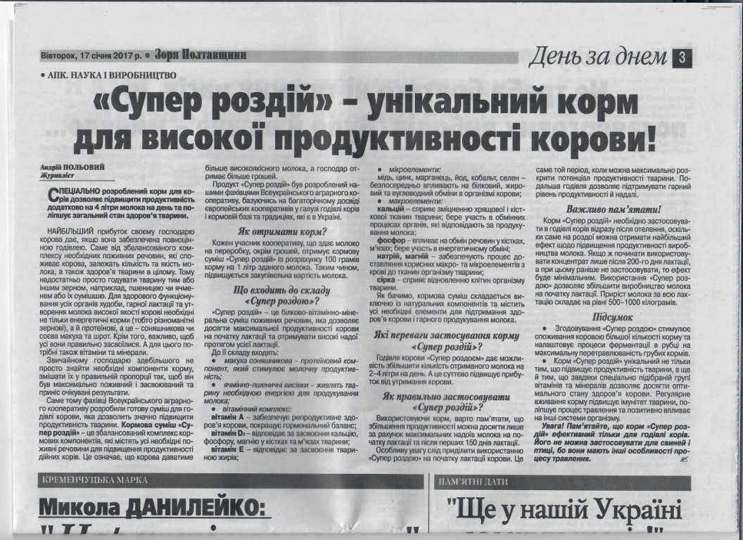 "СУПЕР РОЗДІЙ"- УНІКАЛЬНИЙ КОРМ ДЛЯ ВИСОУКОЇ ПРОДУКТИВНОСТІ КОРОВИ